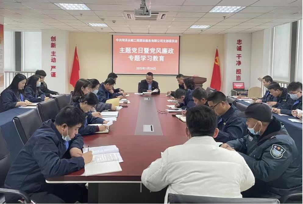 為扎實推進全面從嚴治黨工作走深走實,1月24日,永順工程黨支部開展主題黨日暨黨風廉政專題學習教育。會議由支部書記牛忠建主持,公司全體黨員、團員、中層副職及以上人員參加。