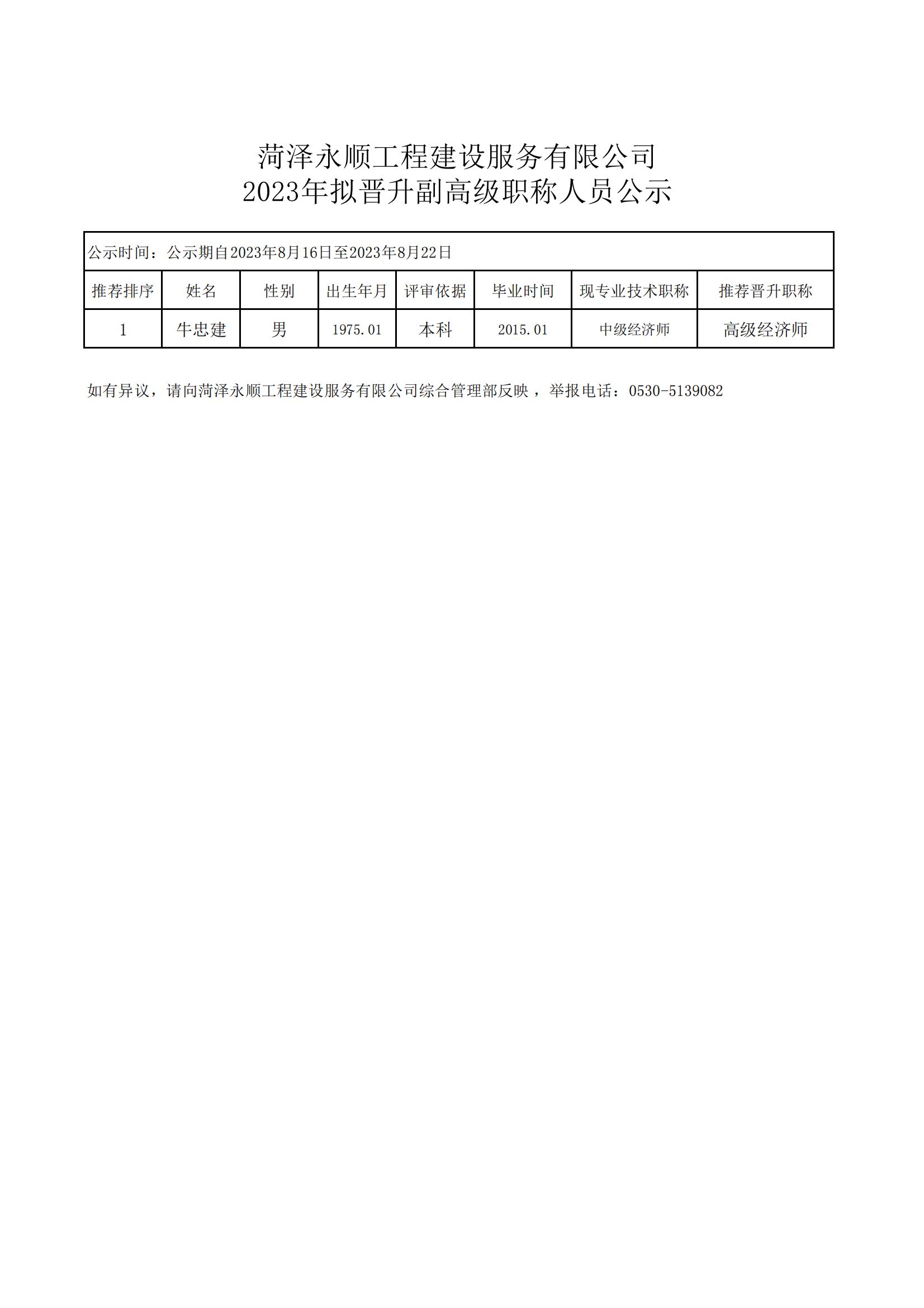 菏澤永順工程建設(shè)服務(wù)有限公司 2023年擬晉升副高級(jí)職稱人員公示