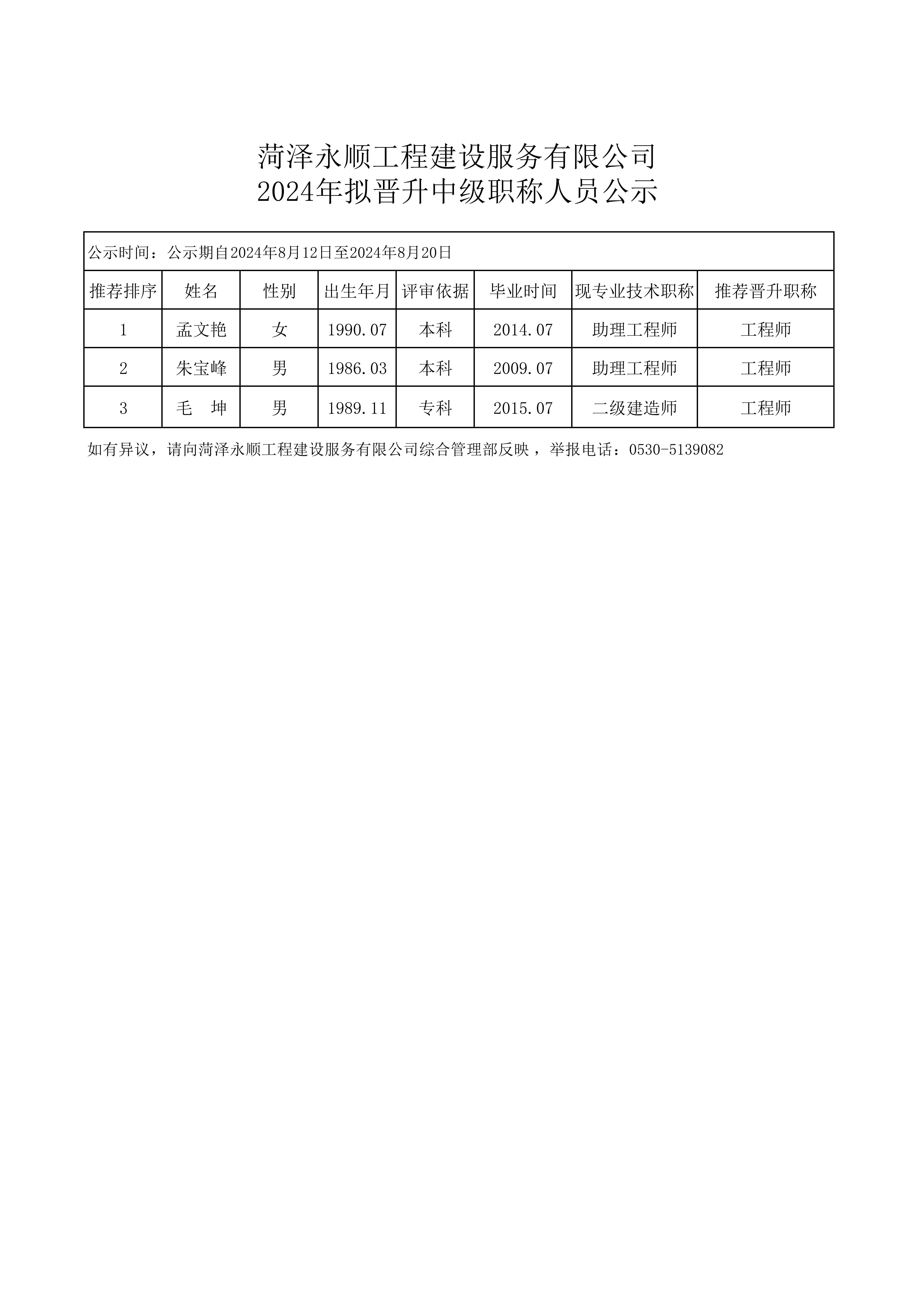 菏澤永順工程建設服務有限公司 2024年擬晉升中級職稱人員公示