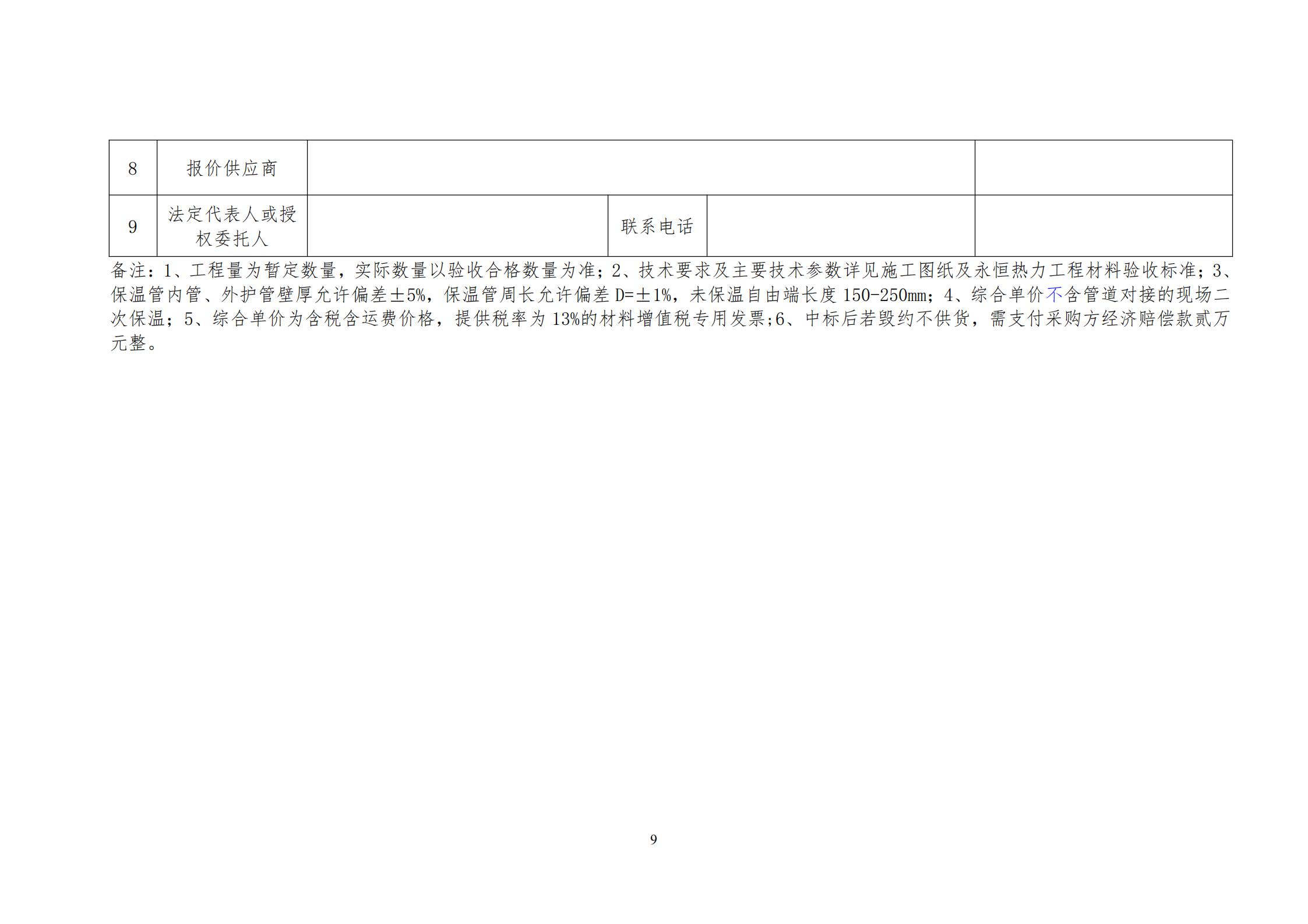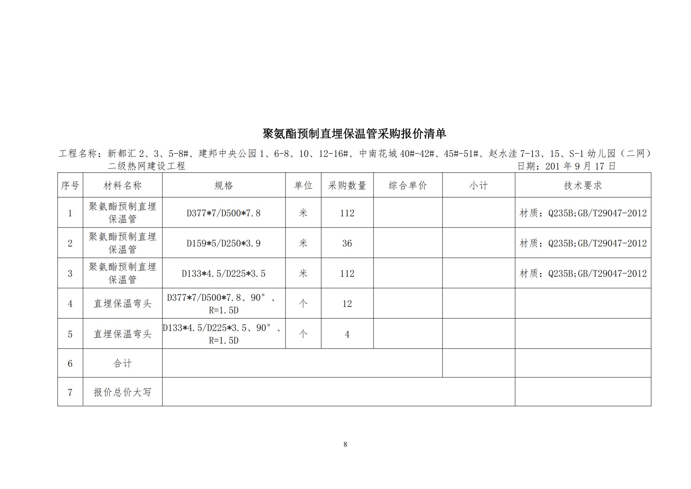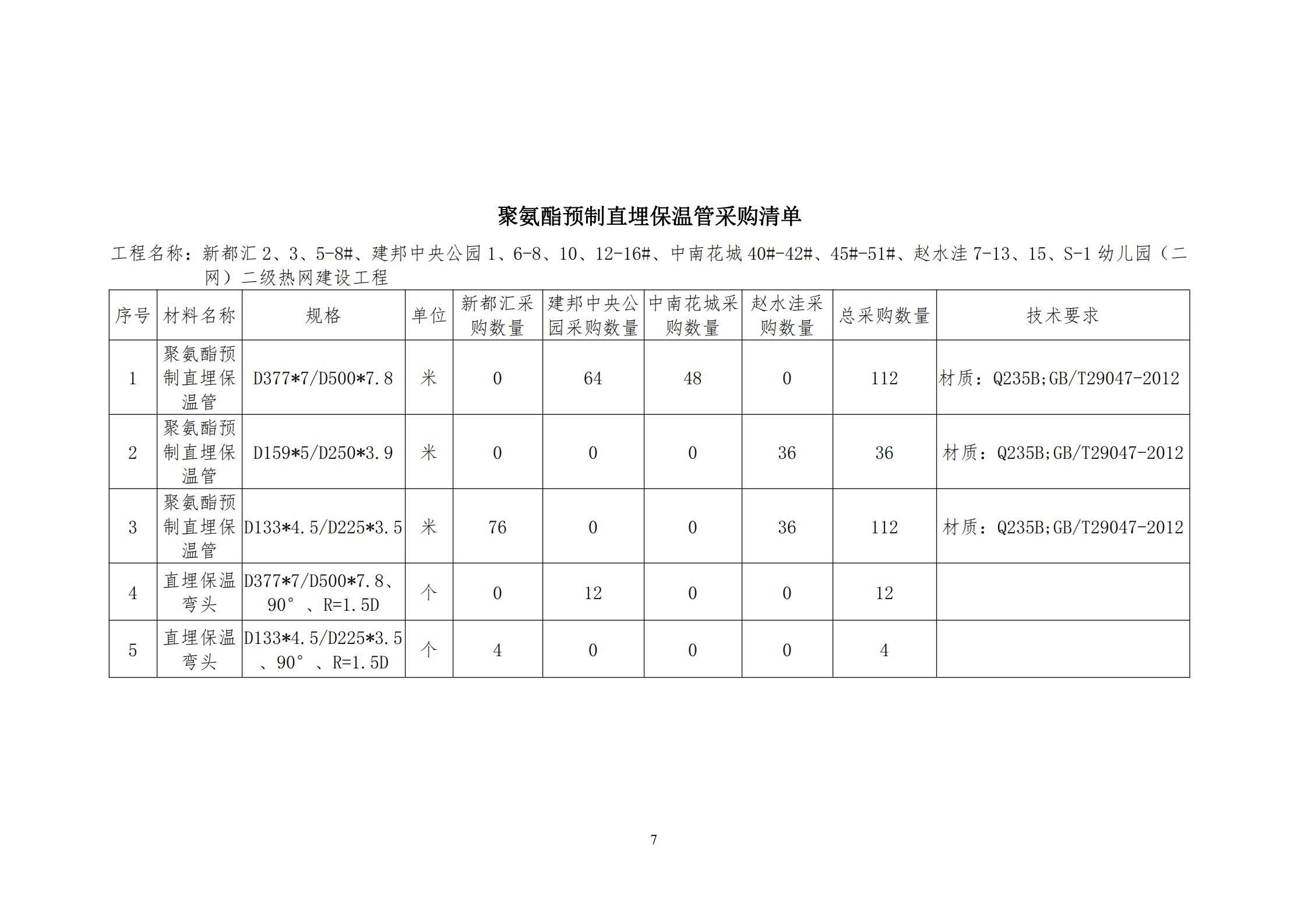 1.材料采購內(nèi)容:新都匯2、3、5-8#二級熱網(wǎng)建設(shè)工程、建邦中央公園1、6-8、10、12-16#二級熱網(wǎng)建設(shè)工程、中南花城40#-42#、45#-51#二級熱網(wǎng)建設(shè)工程、趙水洼7-13、15、S-1幼兒園(二網(wǎng))二級熱網(wǎng)建設(shè)工程用聚氨酯預(yù)制直埋保溫管及保溫彎頭,具體規(guī)格要求、數(shù)量詳見材料報價清單。
